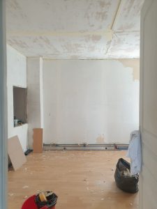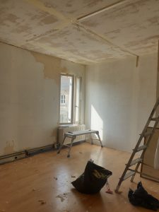 Transformation d’une chambre abîmée : arrachage du papier peint, réparation des fissures (creusement, rebouchage, bandes), ratissage complet des murs et plafond, puis application de deux couches de peinture pour un résultat lisse et moderne. JDMS Rénovation, expert en rénovation intérieure.